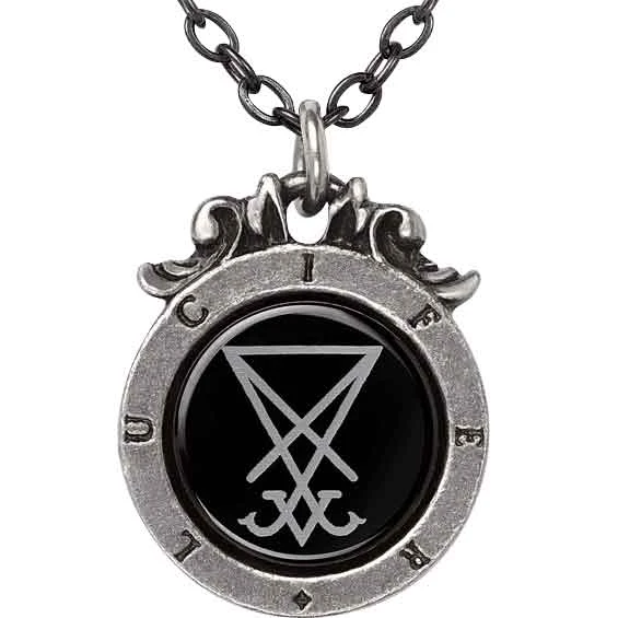 Finish off your dark gothic look with the perfect final touch. Wear the Seal of Lucifer Necklace or add it to your wardrobe. Made from pewter, this gothic necklace has a bale at the top for sliding on the included trace-style chain. The black chain fastens with a lobster clasp. Next, the necklace features a circular design. There is some small scrollwork at the top. Wrapped around the edges are the letters that form Lucifer. In the black center, there is a grey depiction of Lucifers seal. This demon necklace makes a wonderful addition to any gothic outfit or gothic jewelry collection.