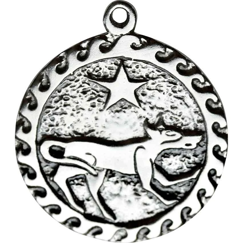 Perfect for anyone who loves celestial designs, the Ser Kai Dog Star Necklace references the star Sirius also known as the dog star. This silver-plated necklace has a round shape with a bale at the top for sliding onto the included link chain. To begin with, this necklace features a dog facing right in the center. There is a large star above it. The background surrounding the dog has an antiqued finish. Along the edges, there is a wave-like border. Finally, this Celtic necklace comes with a satin pouch and info leaflet. It makes a great addition to any outfit or nature-inspired jewelry collection.