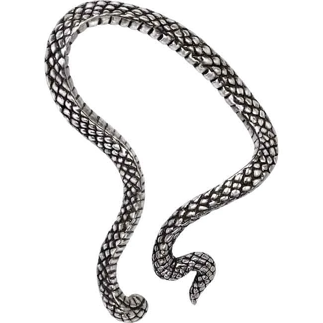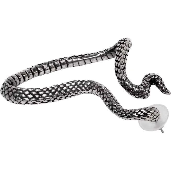 Serpents hold a status of power and cunning in many cultures. Add some snake-like style to your look with the Serpentine Ear Wrap. Made from pewter, this gothic ear wrap comes as a single wrap for the left ear. It has a surgical-steel post at the bottom, which requires a pierced ear. The ear wrap features a snake-like body. Starting at the earlobe, it winds its way up and around the back of the ear, ending in a pointed tail. You can easily add the Serpentine Ear Wrap to any gothic or modern outfit as well as any jewelry collection.