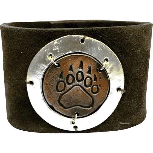 Draw upon the power of the bear when you wear this stunning example of artisan jewelry! The Silver and Copper Bear Print Leather Bracelet features a wide, genuine leather cuff with a metal disc ornament that shows a bear print design. The ornament features an inner copper metal circle etched with the bear print and an outer, silver metal ring that frames the copper. Together, the metals stand out dramatically against the dark color of the leather. This leather bracelet can be adjusted for fit with its double snap closure. This artisanal cuff makes a great gift for the nature lover in your life or a stunning accessory when you want your look to be eye-catching.