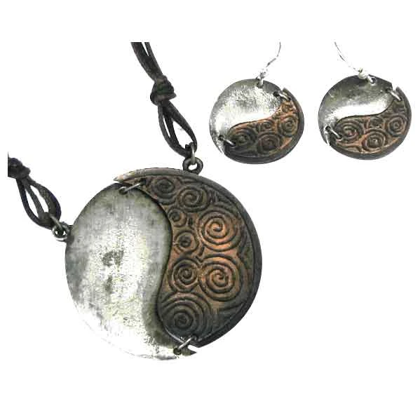 Embrace the impressive look of the Silver and Copper Yin Yang Jewelry Set and easily channel your inner harmony. This unique collection will become a treasured addition to your wardrobe after your proudly wear it in public. Hand crafted from pewter with a silver and copper finish this original jewelry set would be a great accent for nearly for any occasion. Each piece is hand assembled and formed into a water drop shape that can fit perfectly into one another. The darker antiqued copper half has a spiral design to enhance the vibrant polished silver tone of the other half. This set is sold with hook style earrings as well as a pendant that is draped on a stylish cord. Breathe new life into your wardrobe with the Chinese inspired Silver and Copper Yin Yang Jewelry Set.