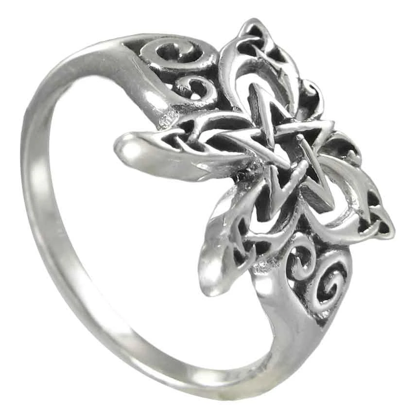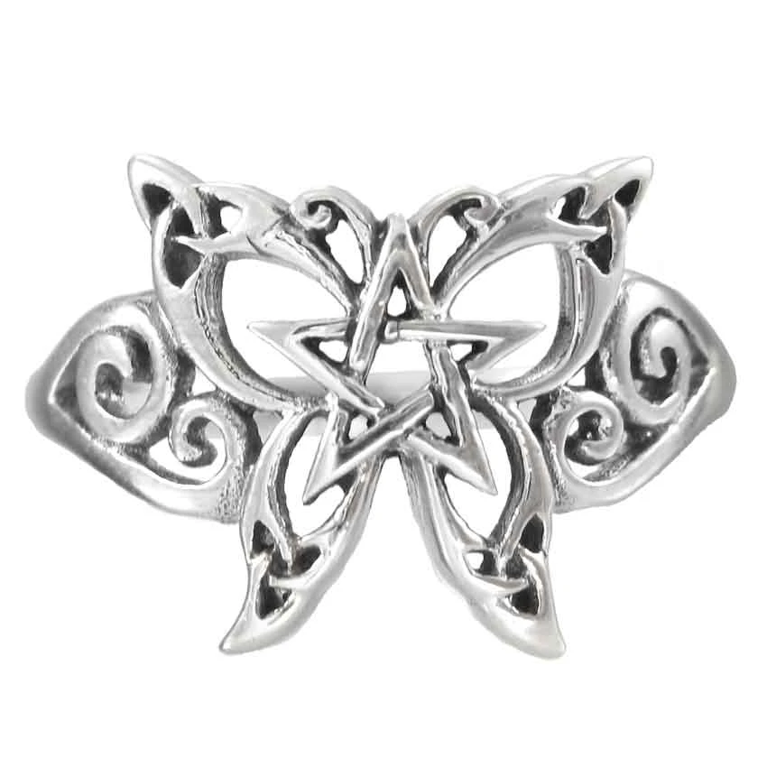 The butterfly is a creature of transformation, and so it seems fitting that a ring that transforms your look, even a little, might bear the butterfly. And this Silver Butterfly Pentagram Ring will, indeed, change your look with its fine Celtic design. The ring is also crafted entirely in pure sterling silver, which lends it a beautiful polished silver metal shine that only enhances its beauty. The ring depicts a butterfly, although instead of revealing the entire creature, only its silhouette is used. Celtic designs and trinity knots complete its outline, while a five-point star creates a new pentacle in its center. Small spiral twists, carved into the ring band link complete the design and pull its look entirely together. The ring is offered in several whole sizes. It is beautiful in its detail, as well as feminine in its overall design, and those qualities serve to make this Silver Butterfly Pentagram Ring a truly astounding accent for any lady to wear, if only to add an intriguing and eccentric new accent to her style.