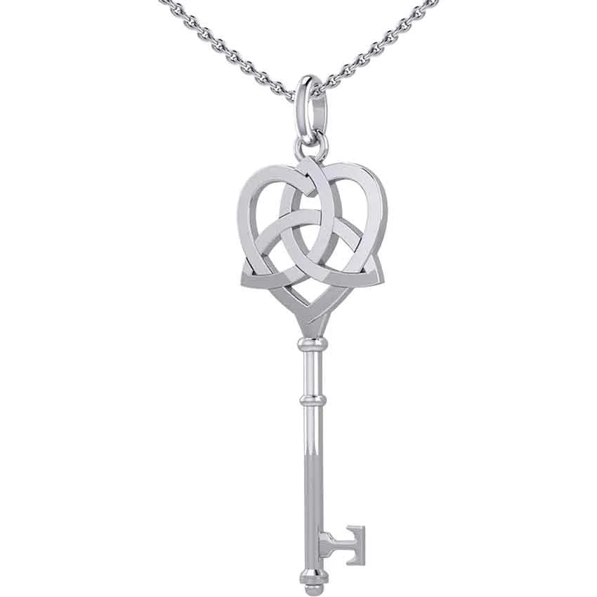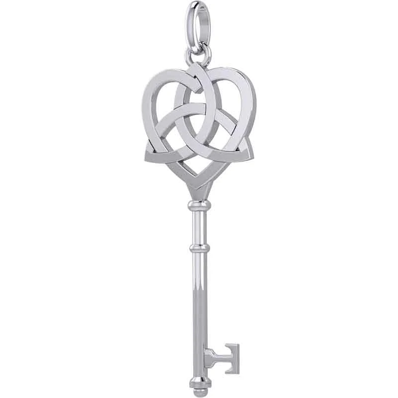 Want to wear the key to your heart? The Silver Celtic Heart Key Pendant features a perfectly romantic design for anyone to wear. Made from sterling silver, this pendant takes the shape of a key. It hangs from a ring-shaped bale at the top for sliding onto a chain, not included. The top of the key features a cutout design. It depicts a heart intertwined with a triquetra. Below the heart, there is a narrow key shaft with a small T-shaped bit. You can add this pendant to a variety of outfits or a Celtic jewelry collection.