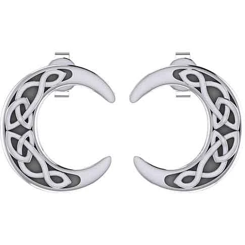 The Silver Celtic Moon Post Earrings are sure to bring some sleek style to any jewelry collection or ensemble that you add them to. Made from .925 sterling silver, these earrings come as a pair. They have post backings. Therefore, they require pierced ears. On the front, the earrings have a crescent shape. Two triquetras adorn each earring. The triquetras have an extra twist on one of their points. They have a black background. These silver post earrings make a lovely personal accessory. You can add them to a Celtic or Wiccan outfit.
