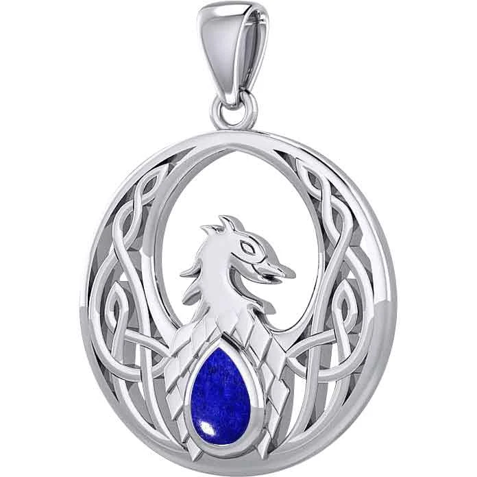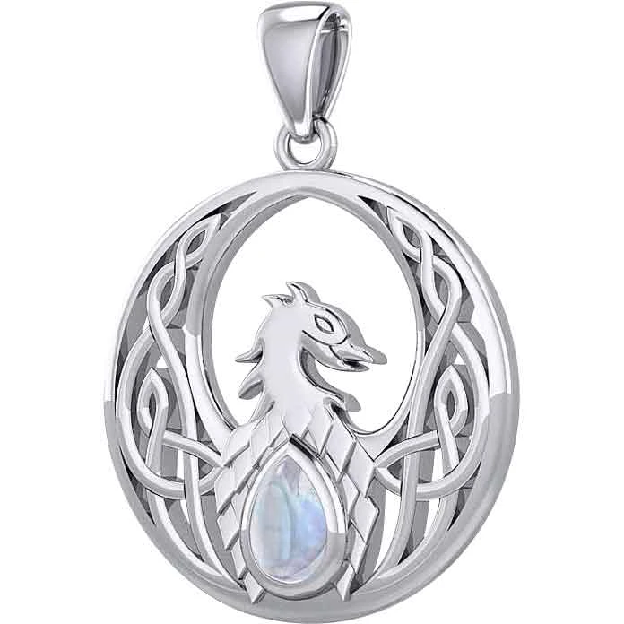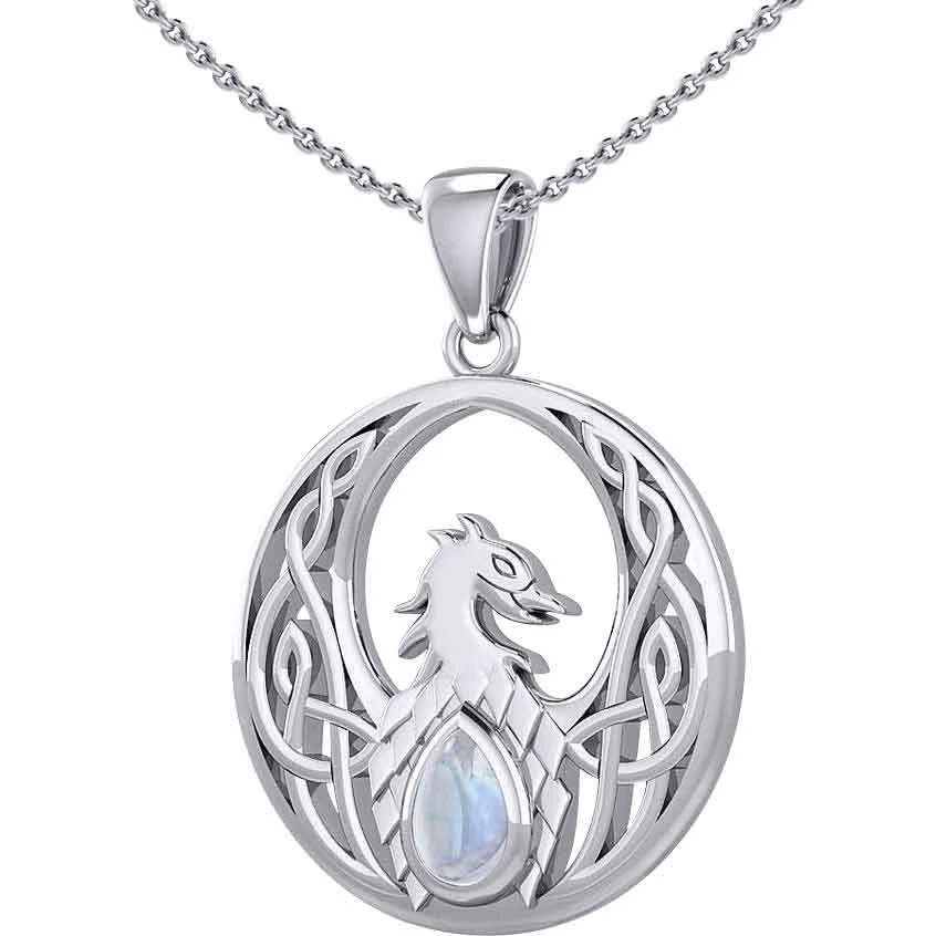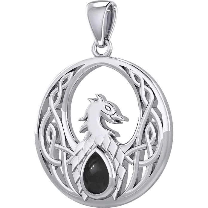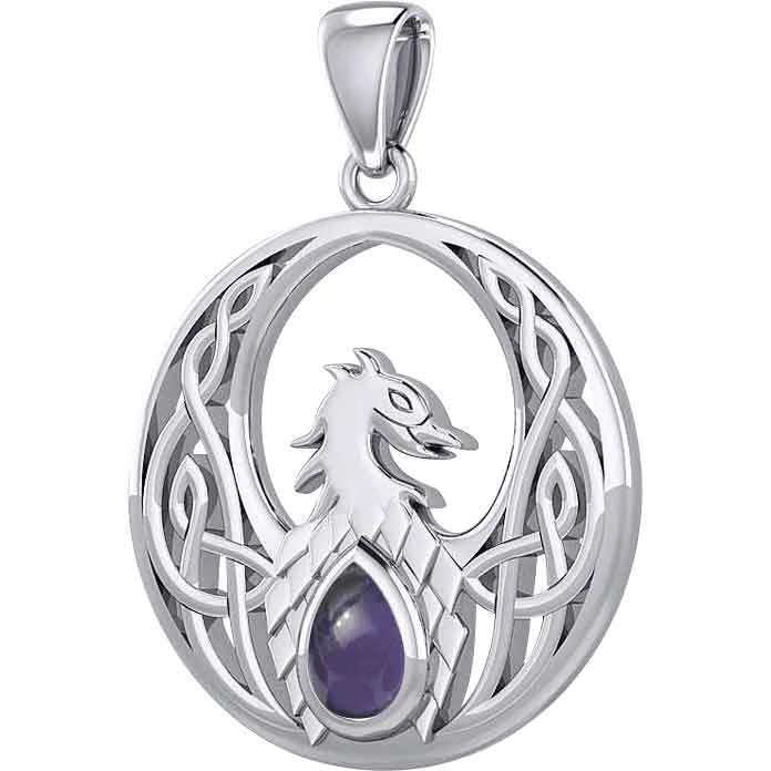 Add the spirit of renewal and life to your daily wardrobe with the phoenix featured in the Silver Celtic Phoenix with Gemstone Pendant. Made from sterling silver, this fantasy pendant has a triangular bale at the top for sliding onto a chain, not included. It has a circular shape. In the middle, there is a phoenix. The wings of the phoenix form the sides of the circle. They have a cutout design. Knotwork forms the wings. In the center of the chest of the phoenix, there is a teardrop-shaped gemstone. The gemstone comes in six options. You can add this silver phoenix pendant to a variety of outfits or a Celtic jewelry collection.