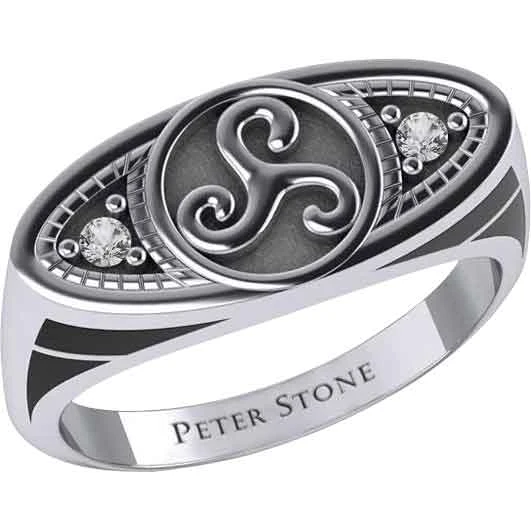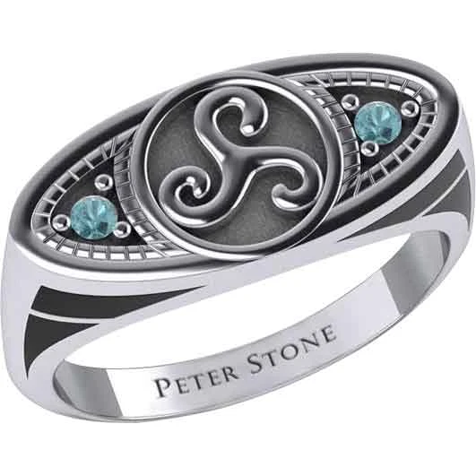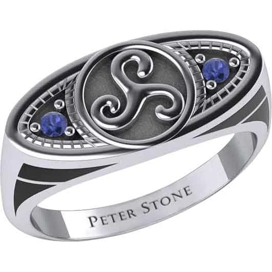 If you love the look of Celtic-inspired symbols and designs, then you are sure to enjoy the Silver Celtic Triskele with Gemstones Ring. Made from sterling silver, this ring comes in a wide range of sizes, allowing both men and women to wear this wonderful piece. This ring has an oval face. In the center of the oval, there is a circular design. It features a triskele. On each side of the circle, there is a section with lined borders. Each section has a round gemstone in the center surrounded by three silver dots. There are seven gemstone options to choose from. This silver triskele ring makes a great addition to any jewelry collection or ensemble.