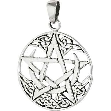 When you want to show off your love of knotwork and Wiccan symbols, you make sure to wear the Silver Crescent Moon Pentacle Pendant. Made from sterling silver, this circular pendant has a triangular bale at the top for sliding onto a chain, not included.