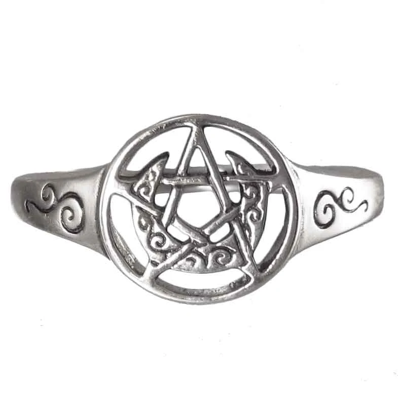 Moon and magic meet in this Silver Crescent Moon Pentacle Ring, creating a pairing of symbols that is both spiritually significant and highly appealing. The end result is that this ring features as much allure as the moon itself does, and perhaps more. The face of this ring features cut-outs in its design, creating a hollow shape that depicts a five point star, bound in an infinite circle – the classic pentacle design. Woven into the pentacle is a crescent moon, engraved with attractive little Celtic twists and twirls. Adorning the band of the ring, on either side of the ring-face, are matching Celtic twist patterns. The ring is crafted entirely in fine, polished, pure sterling silver metal. The hue of this Silver Crescent Moon Pentacle Ring is perfectly suited for the vibrant and bright glow of a moon high in the night sky, which serves to make it a truly distinctive accent to wear for any given event or occasion.