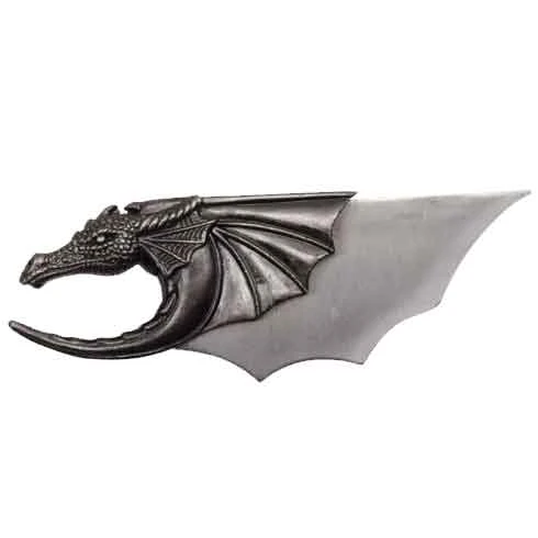 An icon of medieval fantasy myth and lore appears in the nifty, yet stylish form of the Silver Dragon Neck Knife. Whether the beast is a dear companion or a bane, no knight, be you dark or noble, should be without this jewelry piece. This cast metal pendant takes the shape of a winged dragon head. Its reptilian features are well defined in a dark metal finish. A single wing extends from the back while the tip of its tail curves below its jaw. The head of the dragon separates from its wing to reveal a stainless steel blade. Its edges echo the shape of the wing. The wing curves at the end to form the bail that attaches to the silver-colored beaded ball chain.