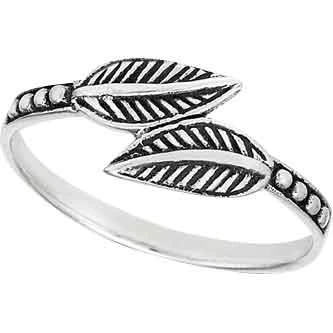Leaves are a popular nature-themed motif in jewelry. Add some to your accessories by wearing the Silver Dual Leaves and Dotted Vine Ring. Made from sterling silver, this ring comes in five sizes. It has a thin band. The band features raised dots between two borders. The band ends in two leaves. One leaf is higher than the other so that the bottom edge of the top leaf rests against the top edge of the other leaf. Both leaves have detailed veining making the ring look like leaves on a dotted vine. This ring makes a wonderful addition to any jewelry collection or everyday outfit. It has a versatile design.