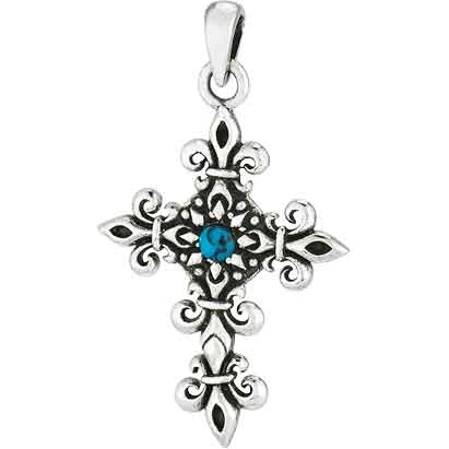 When you want to add a touch of medieval style to your look, you can easily do so by wearing the Silver Fleur Cross with Turquoise Pendant. Made from sterling silver, this medieval cross pendant features a bale at the top. It allows the pendant to slide on a chain, not included. Hanging from the bale is a cross. The ends of the cross have fleur-de-lis tips. In the center, there is a synthetic turquoise gem. Diamond shapes radiate out from the gem. The background has an antiqued finish, contrasting the diamond shapes and fleurs-de-lis. You can add this cross pendant to any medieval jewelry collection or Renaissance outfit.