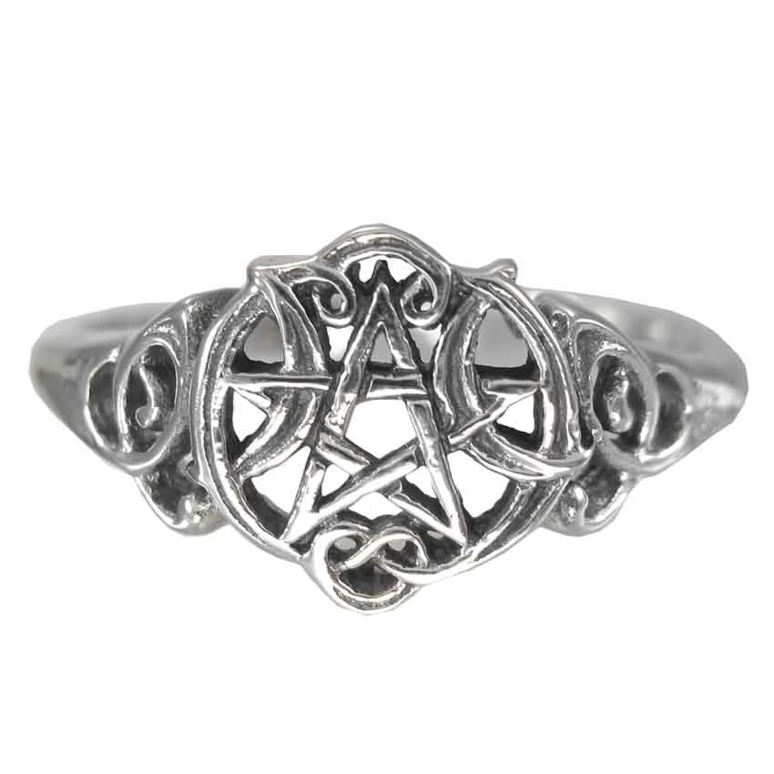 You do not need any mystic power to wield this ring. Instead, the Silver Heart Pentacle Cut Out Ring brings its own mystic touch to your attire, infusing not only great beauty and intriguing design, but also a bit of old pagan symbolism, too. This beautiful ring is crafted entirely in fine sterling silver, and its finish shows how truly elegant that metal can be. The ring-face depicts, in polished silver tones, an intricate design that features a circular knot with heart-shaped accents along its length, which binds in place a five-point star, creating a twist to the iconic pentacle. Two crescent moons loop through either side of the pentacle, while additional trinity knots bind the ring-face to the ring-band. This ring is offered in a variety of full sizes. Symbolically, this ring embodies the movement of a body through life, focused, directed, and guided by both wisdom and intuition. Visually, this Silver Heart Pentacle Cut Out Ring is a lovely accent that serves modern day wiccans, roleplay enthusiasts, and jewelry lovers with equal ease!