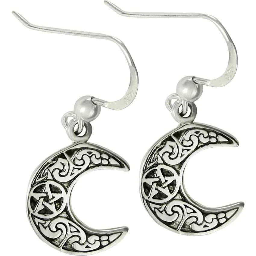 The moon is often associated with transformation, balance, and magic. Bring these elements into your own identity when you wear the Silver Horned Moon Pentagram Earrings. Gorgeous swirls decorate these sterling silver earrings. Presented in a dangle style, these Celtic moon earrings feature faux pearl accents between the crescent moon charms and the French Hook style attachments. A small pentagram is situated within the swirls engraved on each single-sided charm. Pierced ears are required to wear this style. Perfect for special occasion or everyday wear, the magic of the moon awaits you within these Silver Horned Moon Pentagram Earrings.