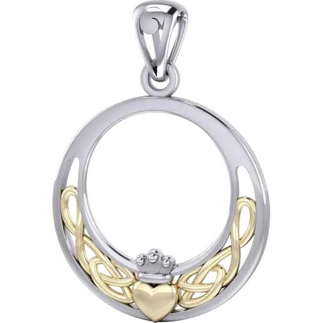 Check out the Silver Irish Claddagh Knotwork Pendant. It makes it easy to add some Celtic style to your outfit or jewelry collection. Made from sterling silver, this pendant has a flat, ring shape with a circular cutout in the center. At the bottom of the pendant, it depicts a crowned heart, the central piece in a claddagh symbol. This pendant features cutout knotwork on each side of the heart rather than hands. The knotwork and heart are gold. At the top of the pendant, it has a bale for attaching a chain, not included. It features a swirl design with a mirror finish. You can add this silver claddagh pendant to a variety of ensembles, including ones for special occasions.