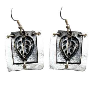 This season enhance your look with an original and daring accent like the Silver Leaf Stamp Earrings. This set can be the subtle addition your look has been needing, so grab a pair for yourself while you still can. Carefully hand crafted from pewter these lovely earrings have vibrant metallic finishes that enhance the rustic motif. Made from two separate pieces and fashioned together with chain links the inner square is stamped with a classic leaf design and plated in antiqued silver while the border has a shimmering polished silver. This item is sold as a pair of hook style earrings so they can be conveniently worn with any outfit. Balancing breathtaking beauty with a modern look the Silver Leaf Stamp Earrings can become your signature fashion item.