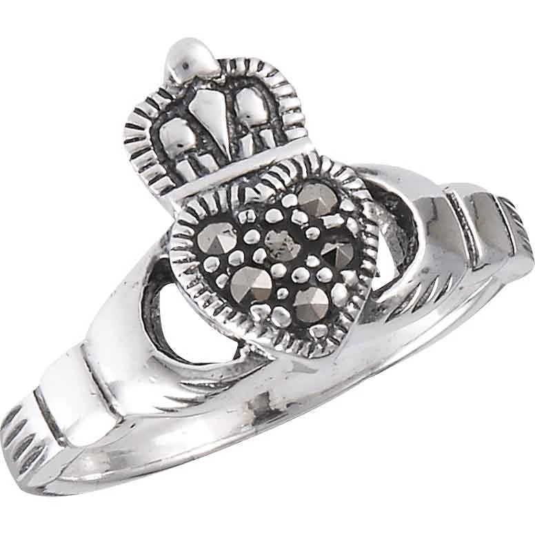 One of the most iconic Celtic jewelry designs, the Claddagh ring symbolizes friendship, love, and loyalty. The Silver Marcasite Claddagh Ring displays the traditional crowned heart held between hands with Marcasite in the heart. This sterling silver ring possesses a detailed design with a patterned crown and etch marks outlining the crown and heart. This Celtic accessory makes the ideal gift for sweethearts or a fantastic personal accessory.