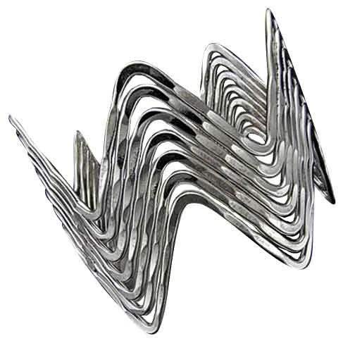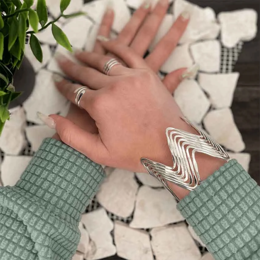Recalling the rolling beauty of ocean waves, this charming silver bracelet features thin bands of metal that create a wavy, rippled effect. The Silver Ripple Cuff combines classic style with a hint of modern flair for a stylish look. Handcrafted from brass with silver plating, this fine artisan accessory suits many different outfits, making it a versatile piece for your wardrobe. The silver cuff gaps at the back to allow you to easily put it on and take it off. This elegant metal bracelet goes well with other pieces of our artisan jewelry for a completed ensemble!