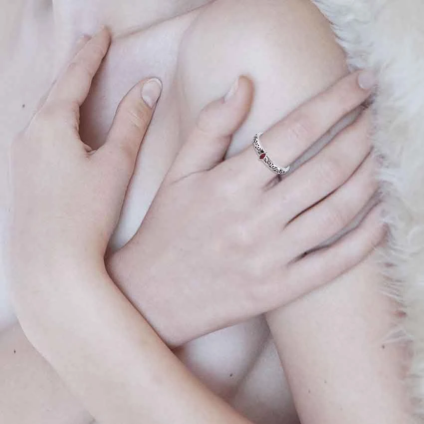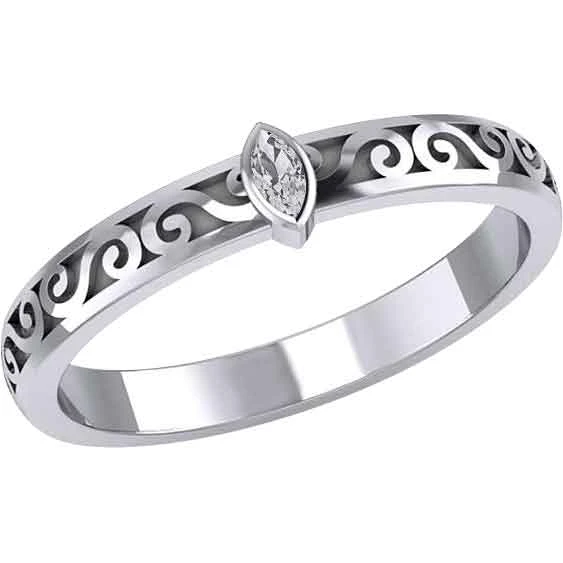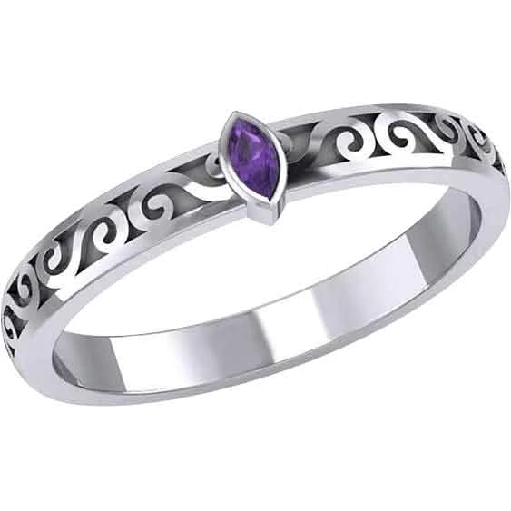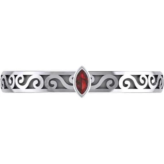 The Silver Scrollwork with Marquise Gemstone Ring is an elegant piece of jewelry, perfect for those looking for a lovely ring to wear. Made from sterling silver, this ring comes in a wide range of sizes, allowing both men and women to wear this wonderful piece. This ring features a band with a carved design. S-shaped scrollwork adorns the band of the ring. At the top, there is a marquise-cut gemstone. There are four gemstone options to choose from. This silver scrollwork ring makes a great addition to any medieval or Renaissance jewelry collection. It is a wonderful personal accessory.