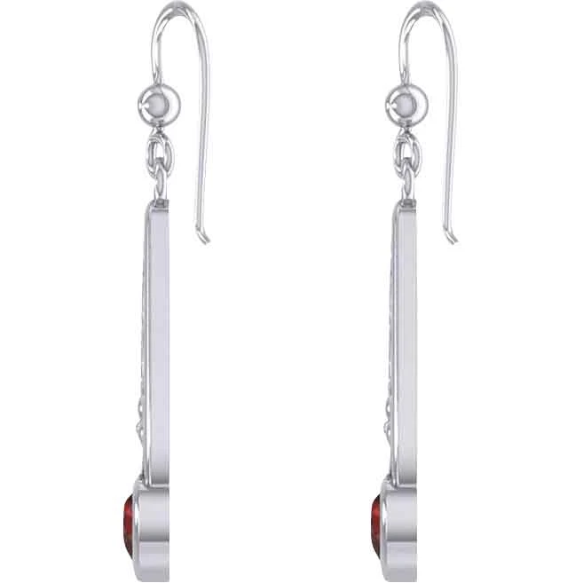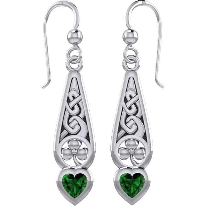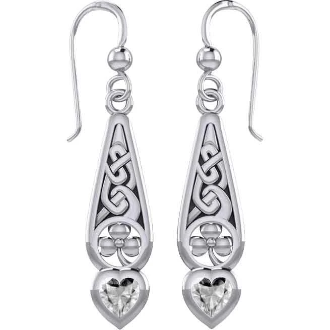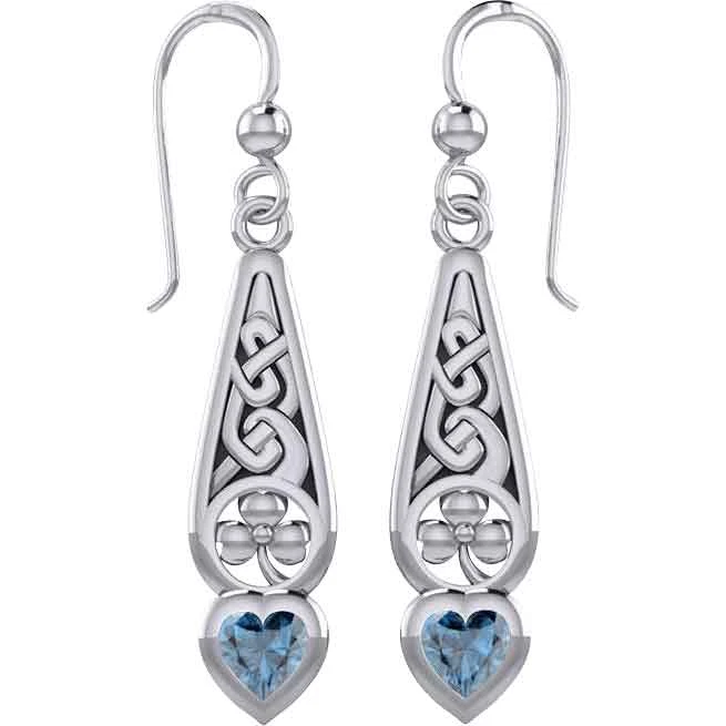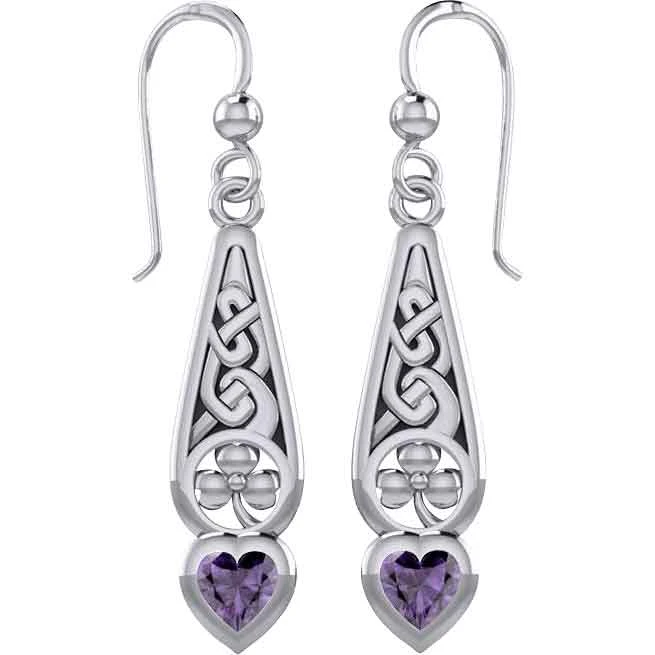 For an elegant addition to your outfit, the Silver Shamrock and Heart Knotwork Earrings are sure to bring some great Celtic style and flair. Made from sterling silver, these earrings come as a pair. They have fishhook backings. Therefore, they require pierced ears. The earrings hang from loops attached to the hooks. Each earring has a teardrop shape. Most of the teardrop features a unique knotwork pattern with a black background. At the bottom of each teardrop is a cutout three-leaf clover in a circle. Below the clover circle, there is a heart-shaped gemstone. There are five options to choose from. You can add these shamrock and heart earrings to a variety of outfits, including ones for special occasions.