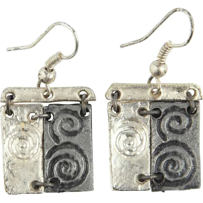 Complete your look this season with a little fashion help from the always elegant Silver Spiral Earrings. This extraordinary jewelry accessory will add a new dimension to your wardrobe, so grab a pair while you still can. Carefully crafted from high quality pewter these hand assembled earrings are finished in both antiqued and polished silver. Held together by 4 ringlets the rustic look is only overshadowed by the contrasting metallic plating. Two planks each have engraved spiral designs that give these earrings and ancient tone. This item is sold as a set of hook style earrings that can be worn with any look. You do not want to pass up an opportunity to dazzle your friends and family with the versatile Silver Spiral Earrings.