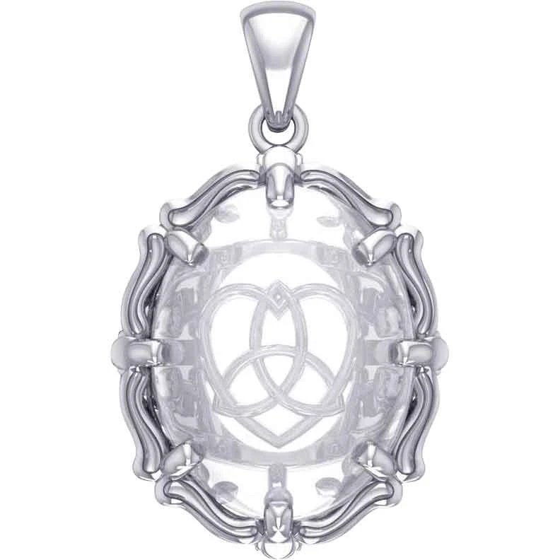 If you are looking to add some romantic style to your jewelry collection, then check out the Silver Trinity Heart with Clear Quartz Pendant. Made from sterling silver, this Celtic pendant has an oval shape with a triangular bale at the top for a chain, not included. The pendant has wavy edges along its sides. In the center, it has a clear quartz stone on the front which shows the design on the back. The back design features a cutout trinity knot interwoven with a heart. This pendant is a lovely personal accessory. Add it to your favorite outfit or ensemble.