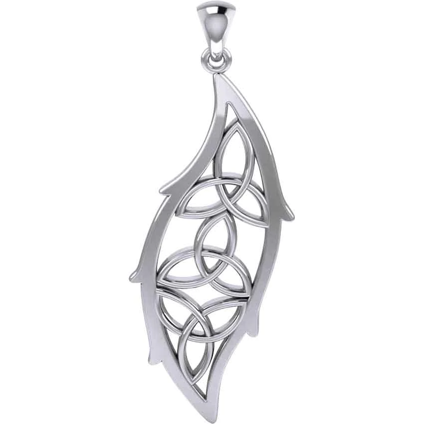 If you love leafy designs in your jewelry, then the Silver Triple Trinity Knot Leaf Pendant will match your style and add a Celtic twist. Made from sterling silver, this pendant takes the shape of a leaf with a triangular bale at the top for adding a chain, not included. The two sides of the pendant have a slightly wavy shape with ridges for a leafs tips. The center of the leaf is cutout revealing the knotwork designs. This section has three trinity knots. The bottom knot faces in the opposite direction from the other two knots. This pendant makes a lovely personal accessory, adding Celtic style to any outfit.