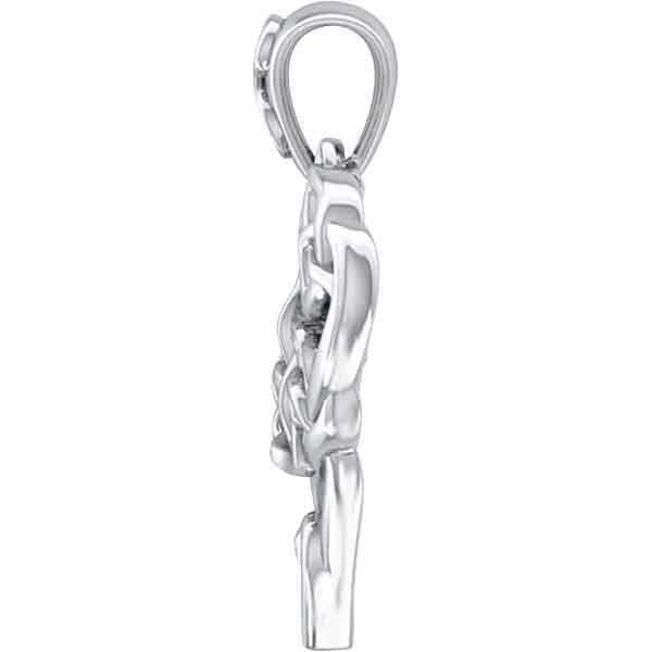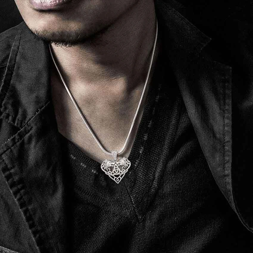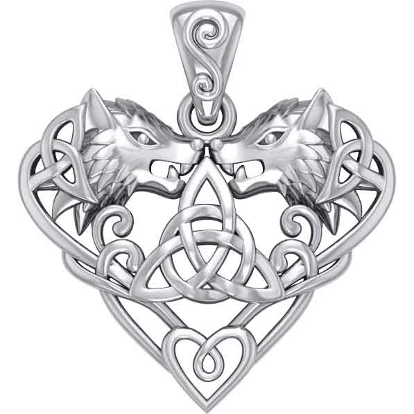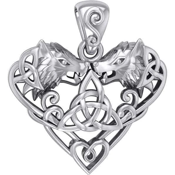 The Silver Wolves with Celtic Triquetra in Heart Pendant is sure to please your sense of style if you like wolves and Celtic knotwork. Made from sterling silver, this pendant has a cutout heart design with a triangular bale at the top for a chain, not included. A swirl adorns the bale. Meanwhile, there is a triquetra interwoven with a ring in the center of the pendant. Surrounding it is additional knotwork which forms the overall heart shape as well as a smaller heart at the bottom. At the top of the heart, there are two wolf heads facing each other. Each wolf head has its mouth open, revealing its teeth. This silver heart pendant is a wonderful personal accessory. It adds unique style to any outfit.