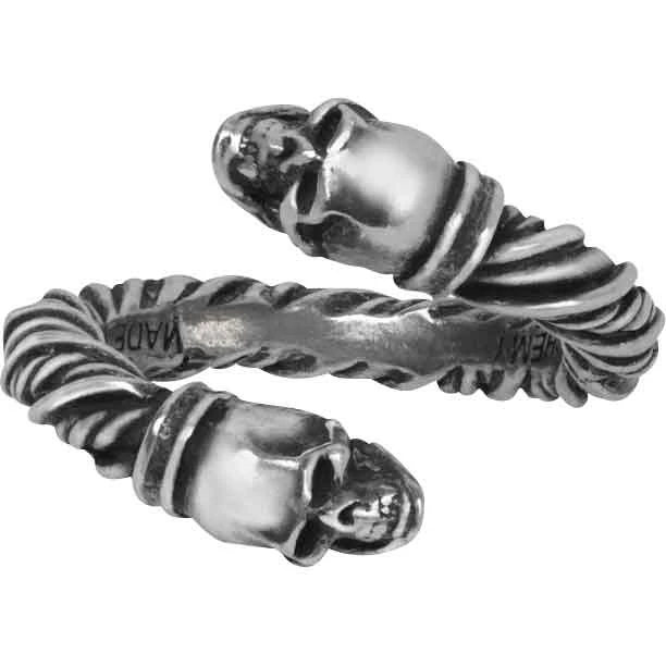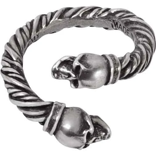 Do you wish that you had an accessory that gave off a macabre warrior vibe? Make sure to check out the Skull Battle Ring. Made from pewter, this gothic ring comes in two sizes. It has a twisted torc-like band. The band is open-ended with the ends facing different directions. Each end features a detailed skull. This ring makes a great personal accessory or an addition to a skull-inspired jewelry collection.