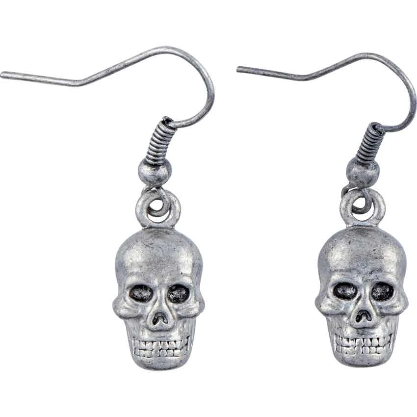 Complete that look that you have been waiting to reveal to the world with the stylish and shocking Skull Earrings. This set of jewelry can become your personal fashion signature when you proudly wear it to your next social event. This pair was constructed from quality lead free pewter and has an original finish. A stunning level of molded and engraved detail has been applied to each earring. The skulls have been articulated with darkened eye holes, a nose hole, and a set of chattering teeth. This item is sold as a set of hook style earrings so they can be paired with any outfit. Embrace the versatility and gothic tones of the dynamic Skull Earrings.