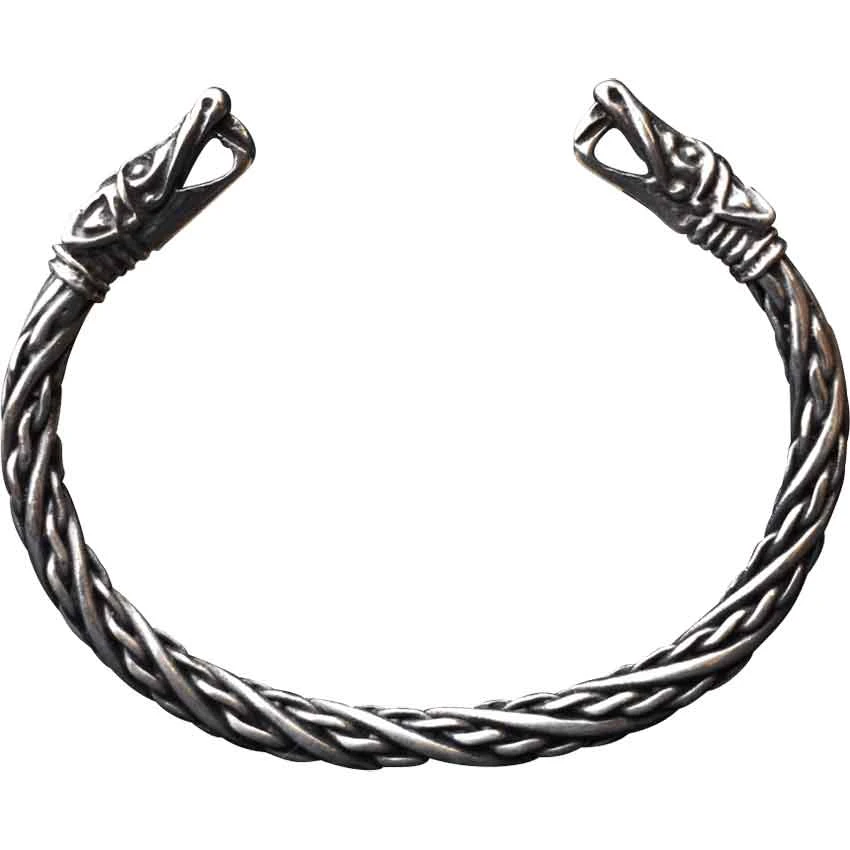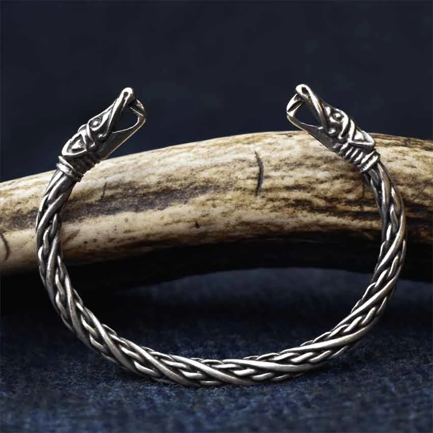 At each end of the open Norse bracelet, there is a dragon head. Each Viking dragon head has its mouth open, revealing its fangs. The bracelet comes with care instructions. You can wear this Nordic dragon bracelet with a variety of Celtic and Viking looks. It also makes a great addition to a Celtic jewelry collection.