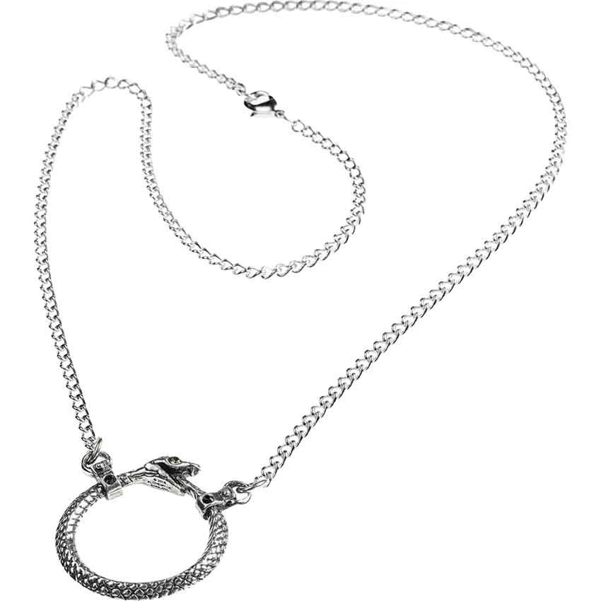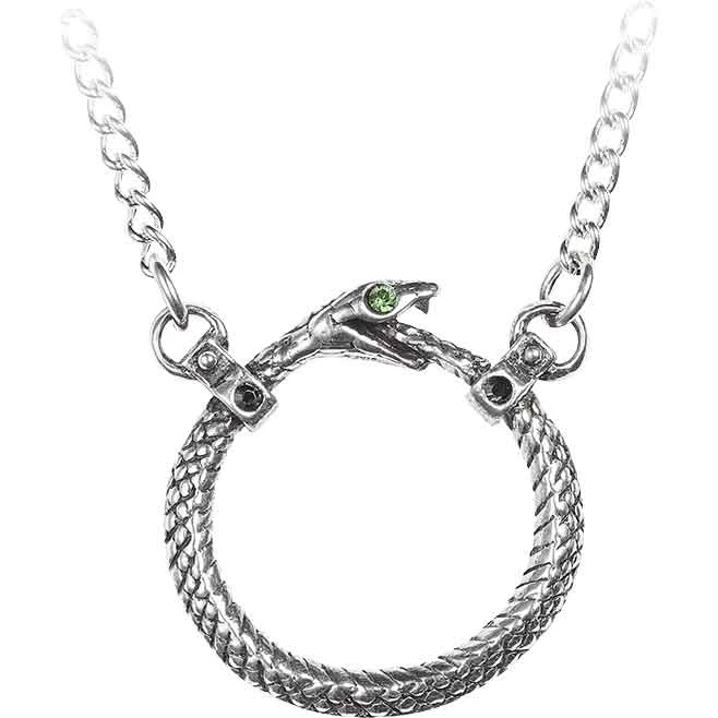 The Sophia Serpent Necklace wonderfully depicts an ancient symbol, the ouroboros. Made from fine English pewter, this gothic necklace resembles a snake biting its own tail. Set into the eye sockets of this serpent are two green Swarovski crystals. Engraved lines form the intricate scales of the snake. Near the end of its tail and its neck, there are links adorned with black Swarovski crystals. The links connect to the necklaces chain. The chain fastens with a lobster clasp. This necklace elegantly matches our Sophia Serpent Ring (AG-R206) and Earrings (AG-E403), each sold separately. Wear this necklace with any gothic or snake inspired outfit. It brings some elegant style to any ensemble that it is in. You can add it to any jewelry collection.
