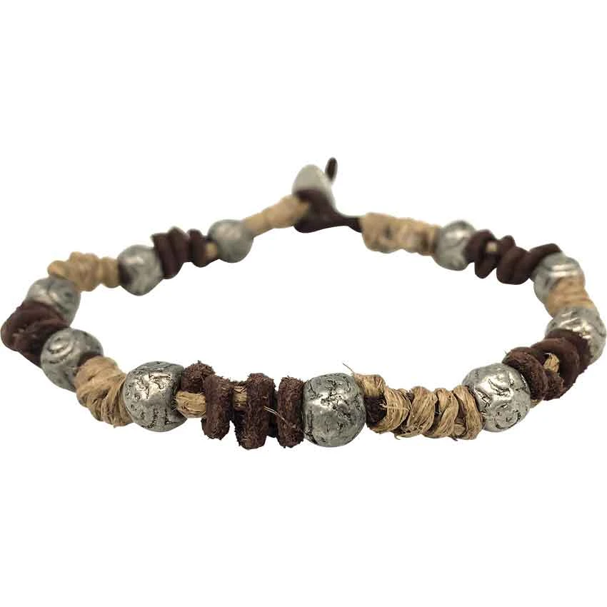 Warriors also choose to accessorize their ensembles. They look great with jewelry pieces like the Spiral Bead Corded Viking Bracelet. Made from recycled jute and leather cord, this bracelet secures with a toggle design onto the wearers wrist. It has a multi-section design. Plated brass beads separate each section. Each bead has a spiral design engraved into it. Next, each section features a jute cord or leather cord wrapping around the other cord. The sections alternate. For example, one section may have a leather center while jute cord wraps around the leather, making the section mostly natural in color. The sections next to it will be brown in color as the leather cord would then wrap around the jute. This bracelet is wonderful for those who prefer a rustic flair with their accessories. The Spiral Bead Corded Viking Bracelet works well with a variety of outfits, including modern ones.
