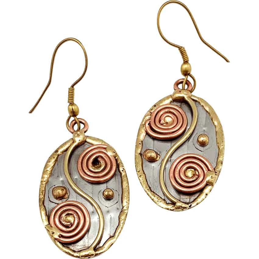 Looking for a unique pair of earrings to finish off your costume? If so, make sure that you take a look at the Spiral Yin and Yang Earrings. Handmade from stainless steel, these earrings come as a set of two. They feature fishhook backings. Thus, they require pierced ears. Each earring has an oval shape. An S-shaped brass line runs down the center of each earring. Near each curve of the line, there is a copper spiral. These opposing spiral forms a design resembling a yin-yang symbol. There is also a smaller brass dot next to each spiral. These earrings are great for both modern and fantasy outfits. Add them to your jewelry collection.