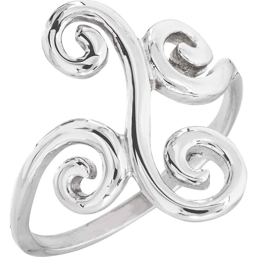 Crafted into an elegant curling scrollwork design, this stainless steel ring makes a stunning addition to any outfit from medieval to modern. The Stainless Steel Spiral Ring displays a central scroll that begins to spiral at each end. This scroll is placed perpendicular to the rest of the thin band, which connects to it by another spiral on each side. The stainless steel material gives this piece a bright and shiny gleam for a fantastic silver metal look. The overall simplicity of the design ensures that this piece can go with casual or formal apparel. It makes a great gift or personal accessory for fans of scrollwork designs.