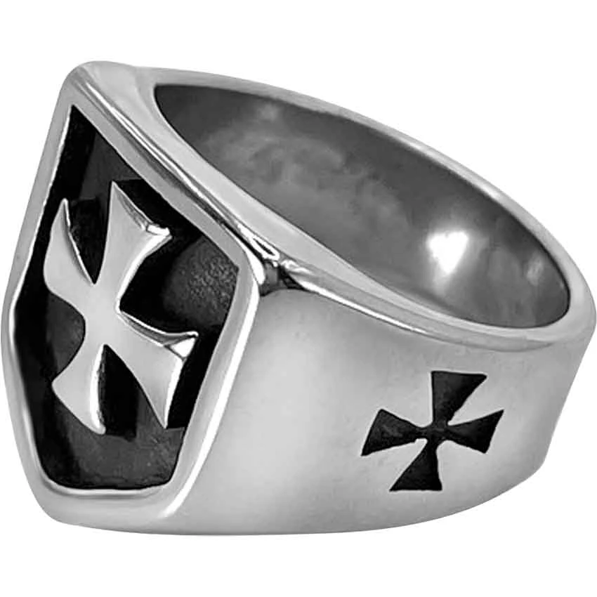 You can add the style of the Crusades to your everyday life, wherever you go, by wearing the Steel Maltese Cross Ring on your finger. Made from stainless steel, this ring comes in a range of sizes. It has a thick band. There is an engraved Maltese cross on each side of the band. On the front, the band features an inset shield shape. The shield has straight sides. In the center, there is a raised Maltese cross in a signet ring style. The cross is silver, contrasting against the blackened background. This ring makes a great addition to any medieval jewelry collection or outfit.