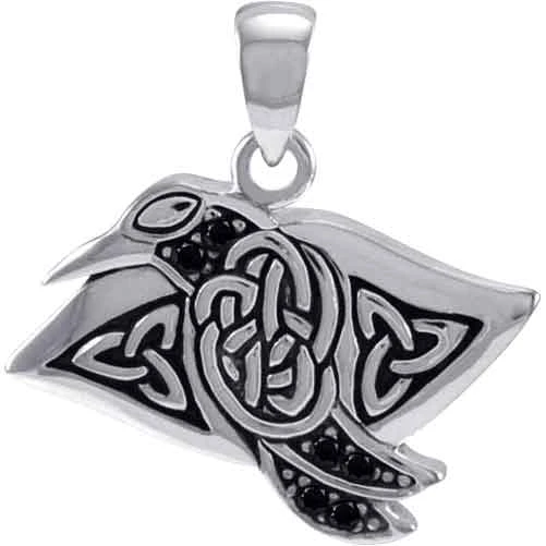 When you are looking to finish off your outfit or add to your jewelry collection, check out the Sterling Silver Celtic Raven Pendant. Made from sterling silver, this pendant takes the form of a raven with a triangular bale on top for attaching a chain, not included. The raven has its wings spread out in flight. Triquetras adorn the wings while another knotwork design forms most of the ravens body. On its head and tail, there are black gemstones adorning the pendant. Add this silver raven pendant to your favorite ensemble or outfit. It looks wonderful with a variety of styles.