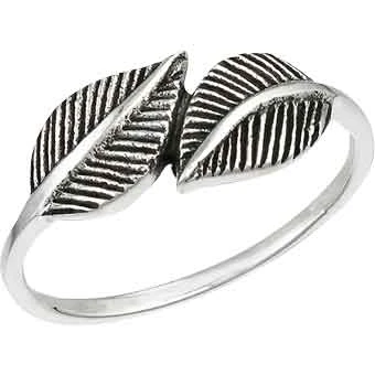 Whether you choose to wear it on its own or with other pieces, the Sterling Silver Dual Leaves Ring is sure to bring some elegant style. Made from sterling silver, this ring comes in five sizes. It features a thin band. The band ends in two leaves. One leaf is higher than the other so that the bottom edge of the top leaf rests against the top edge of the other leaf. Both leaves have detailed veining. This sterling silver ring makes a wonderful addition to any jewelry collection or everyday outfit. It has a versatile design.