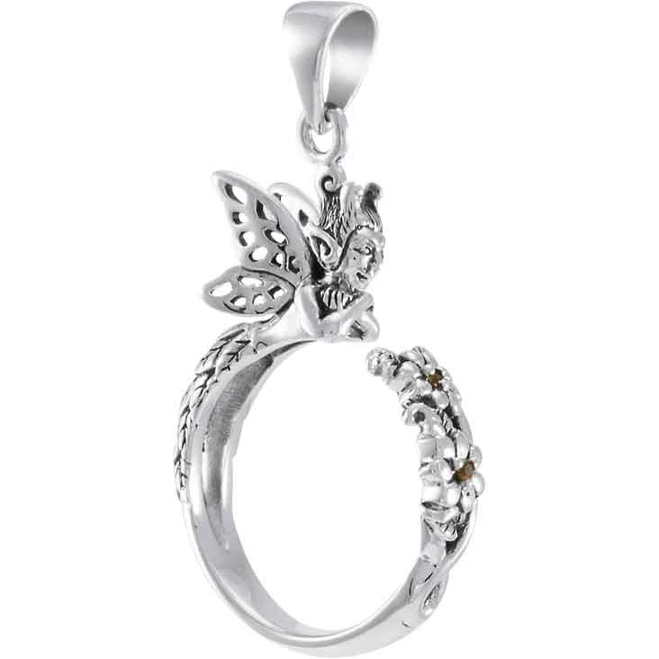 Perhaps you wish to carry a little fairy around with you every day. The Sterling Silver Fairy Pendant can make that dream a lovely reality. Made from sterling silver, this fairy pendant takes the form of an open ring with a triangular bale at the top for attaching a chain, not included. The fairys upper body forms one end of the ring. It appears to rest its chin on its folded arms. It has pointed ears and cutout butterfly wings. Below the fairys waist, the pendant has a leafy design that becomes a smooth band before changing at the other end of the ring. The other end features a couple of flowers with real citrine centers. Add this fantasy pendant to your favorite ensemble or outfit. It looks wonderful with a variety of styles.