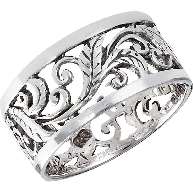Nature possesses its own peculiar beauty, stylized in the design of this wonderful sterling silver ring. The Sterling Silver Foliate Band displays an intricate pattern of scrolling leaves along the center of the silver band. The space around the leaves is cutout with thin edges running along the top and bottom of the band to frame the design. Certain leaves feature etched veins as an additional detail. Crafted from fine sterling silver, this leaf band shows off a bright gleam that highlights its details and catches the eyes of those around you. Give this piece as a present or keep it as a personal accent to show off your love of the natural world!