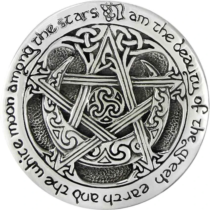 - Features pentacle, moon, and knotwork design
