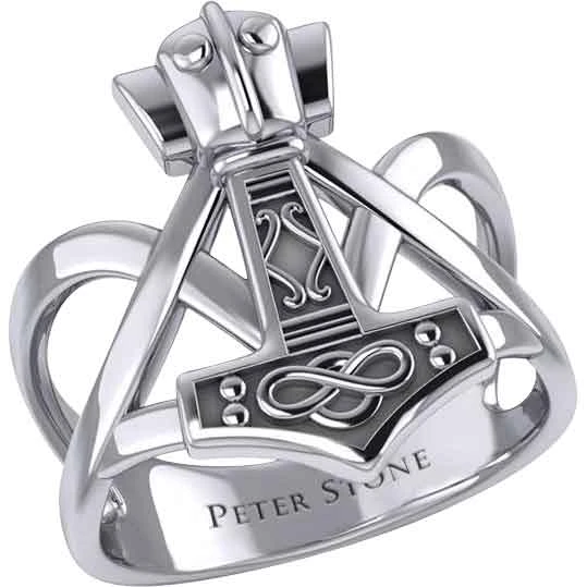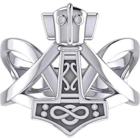 Whether you are a follower of Thor or looking for some great Viking jewelry, make sure to check out the Sterling Silver Thors Hammer Ring. Made from sterling silver, this ring comes in a wide range of sizes, allowing both men and women to wear this wonderful piece. This ring has a band that is wider at the top than the bottom. Also, the band splits into two sections. The sections connect to different parts of Thors hammer, Mjolnir. Small detailing, including an infinity symbol, adorns Mjolnir. Finally, this ring comes with a velvet pouch. This sterling silver ring makes a wonderful addition to any jewelry collection or ensemble.