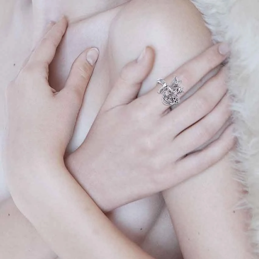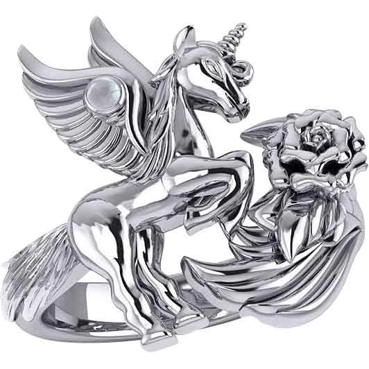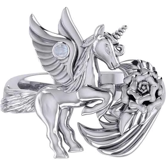 What could seem more magical than a flying unicorn? The Sterling Silver Unicorn with Gemstone Ring wonderfully depicts a unicorn with wings. Made from sterling silver, this ring comes in a wide range of sizes, allowing both men and women to wear this wonderful piece. The ring displays a winged unicorn rearing back. The unicorns tail wraps onto the band. Also, the unicorn has its wings spread out behind it as if in flight. A gemstone adorns the wing of the unicorn. There are two gemstone options to choose from. The unicorns front hooves rest just above a wing-like detail. A rose adorns the detail. This silver unicorn ring makes a great addition to any jewelry collection. You can give it as a gift to any fan of unicorns or fantasy.