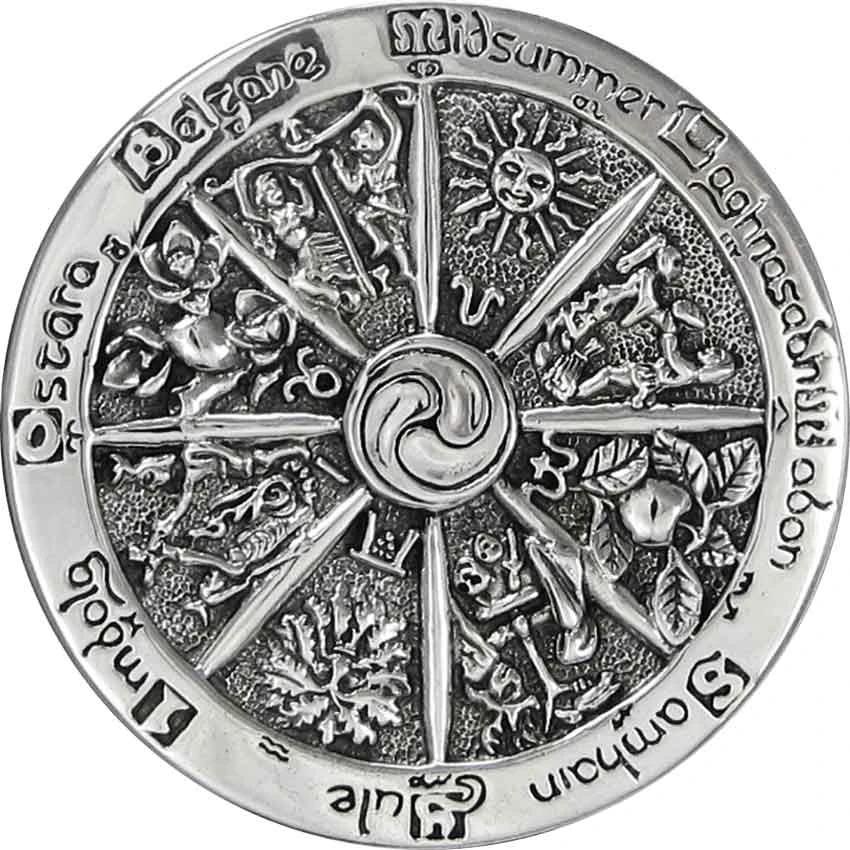 Each season brings its own events, ceremonies, and symbolism in the Sterling Silver Wheel of the Year Brooch. With its incredibly intricate details, this sterling silver accessory depicts the eight different sabbaths of Pagan tradition. Made of high quality, solid sterling silver, this circle pendant has the look of a wheel, with each spoke dividing it into slices that represent each sabbath. Add beauty and balance to your outfits when you accessorize with this gorgeous Pagan pendant.