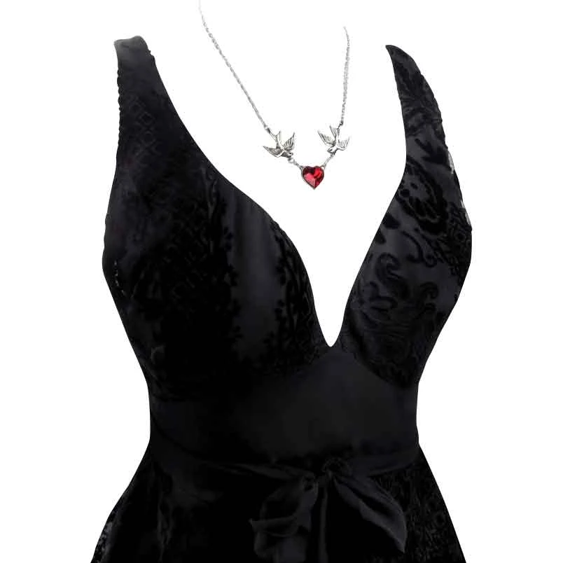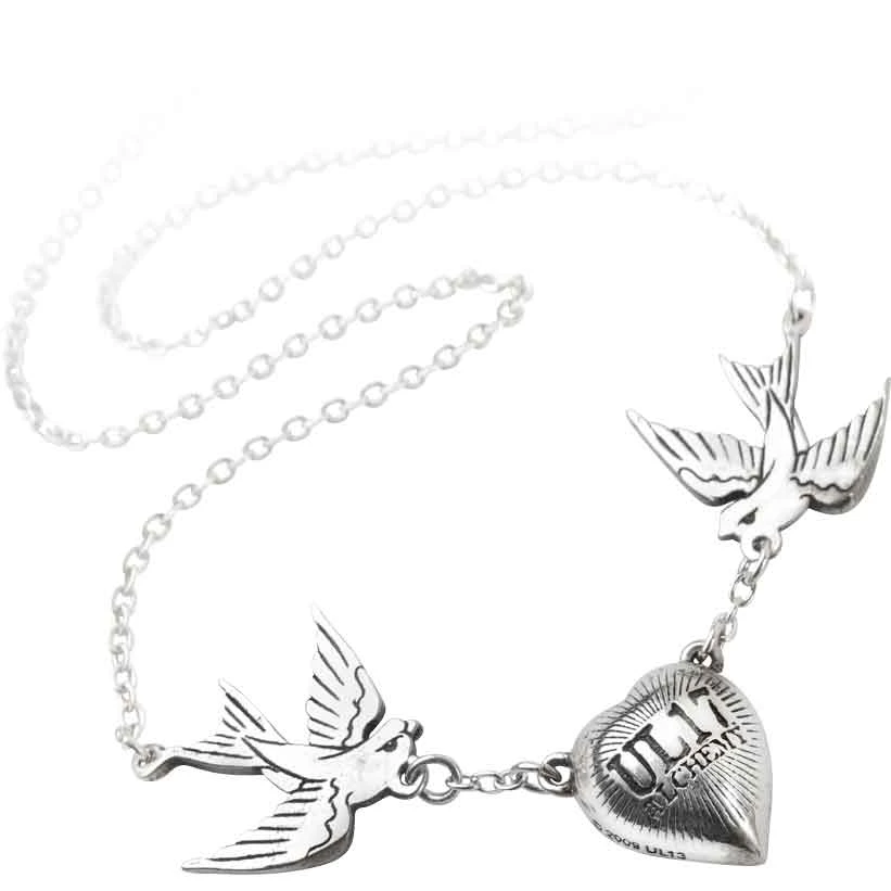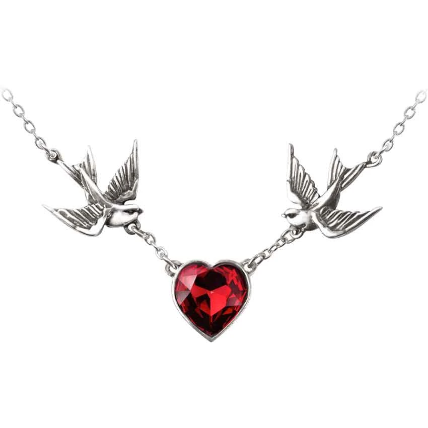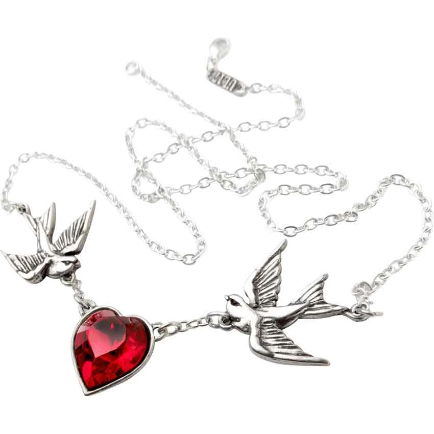 As a symbol for love and loyalty, this Swallow Heart Necklace is hard to beat. The swallow is usually considered to be symbolic of passion and familial ties, making it a perfect companion for the loving heart. Symbolism alone does not account for its beauty, though, and that is due in a large part to the craftsmanship. The central feature of this necklace is a stunningly beautiful and vibrant Swarovski crystal, cut in the shape of a heart and rendered in a deep shade of red. The heart connects to a swallow on each side, linked by short chains. Attached to the swallow tails are the links of the silver chain necklace, which makes this stunning necklace convenient and comfortable to wear. The metallic elements of this pendant are crafted from fine English pewter, which gives them a polished finish that is quite similar to that of silver, only it will retain its luster for much longer. Elegant, subtle, and yet striking in its appearance, this Swallow Heart Necklace is a beautiful example of fine jewelry that would complement just about any look.