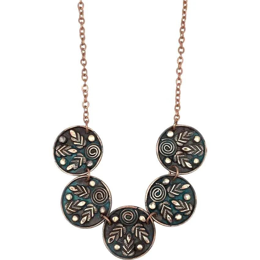 Looking for a necklace to finish off your elven or fairy queen ensemble? Check out the Teal Patina Leaf and Spiral Fantasy Necklace. This copper necklace consists of five circles connected with copper rings. The outer circles attach to the copper necklace chain. Each circle features a teal patina. Towards the inside of the necklace, there is a spiral. Three leaf shapes radiate out from the spiral. There are four brass dots adorning each circle. This necklace adds unique style to any fantasy or modern-day look.
