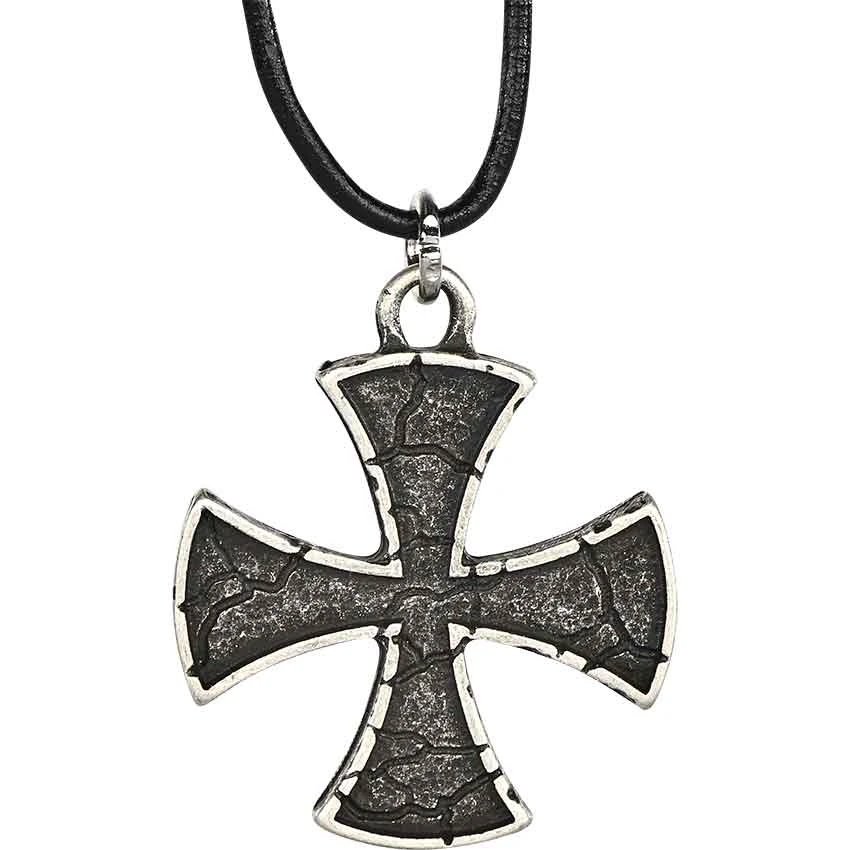 The Templar Cross Necklace makes the perfect finishing touch to a Crusader costume or even a modern, everyday outfit. Made from zinc alloy, this silver-plated necklace comes on a black cotton cord. The cord has a lobster clasp. Hanging from the cord is a Templar cross. It has an antiqued, crackly finish. This medieval necklace looks great with any Templar look or medieval jewelry collection.