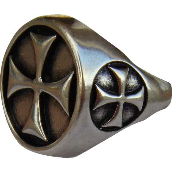 If you are looking for an accessory that you can easily add to a medieval jewelry collection, check out the Templar Cross Signet Ring. Made from zinc alloy, this silver-plated Crusader ring comes in three sizes. It features a wide front face. The front face has an inset Templar cross. It is inside of a deep circle, in a signet-ring style. On each side of the front face, there are two smaller Templar crosses inside of circles. They have antiqued backgrounds. This signet ring is ideal for wearing with a Crusader costume or a modern outfit.