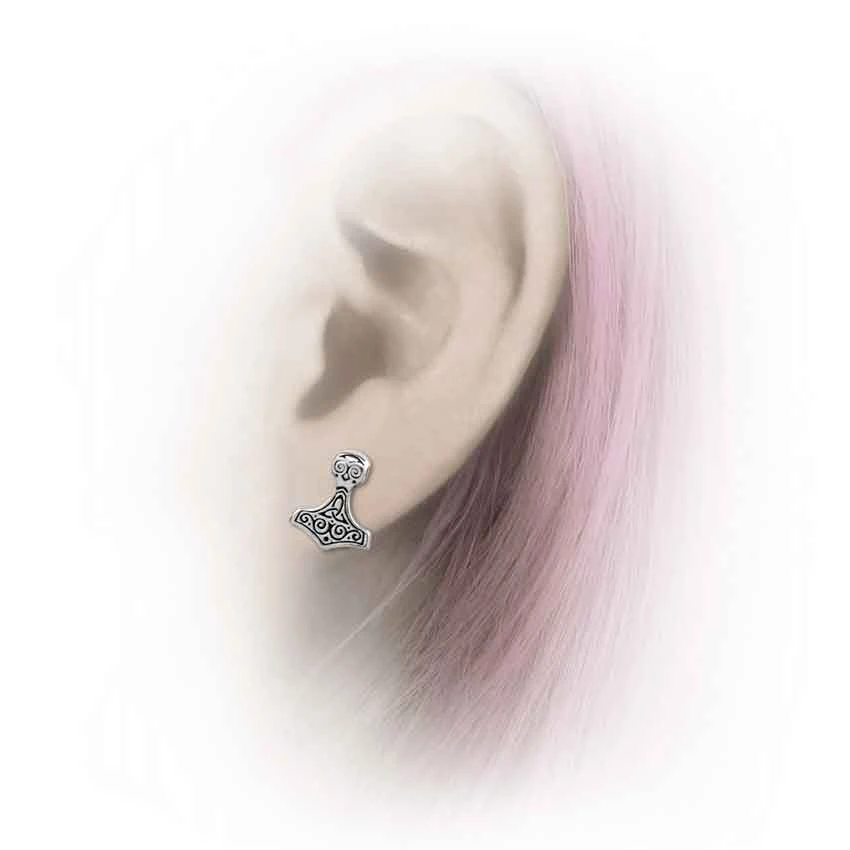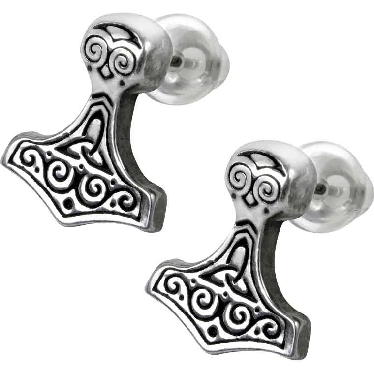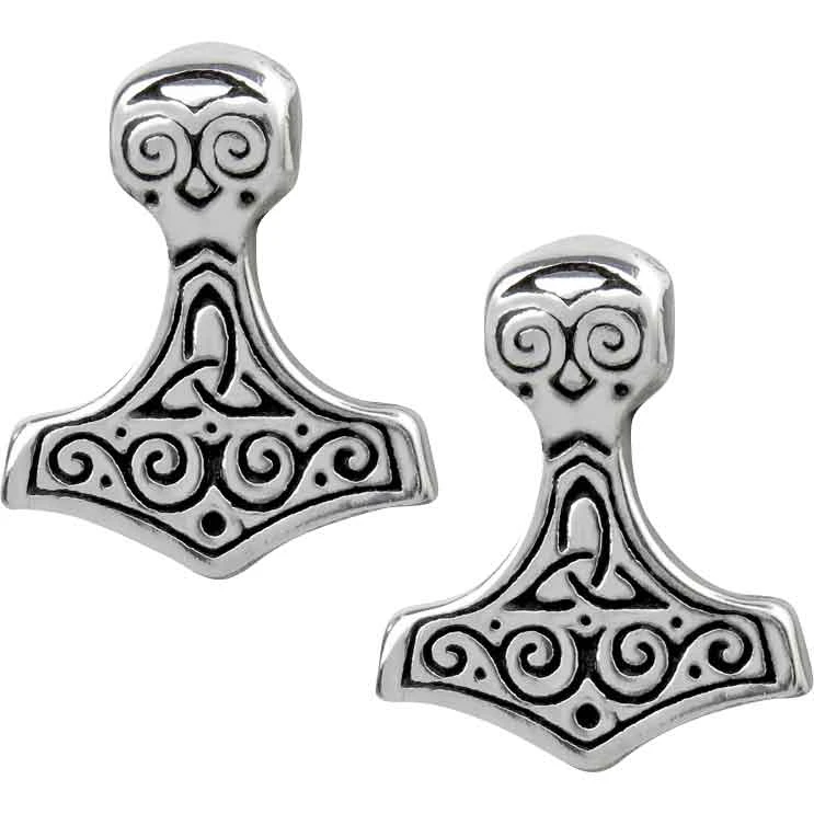 Mjolnir, or Thors Hammer, is an ancient Norse symbol, a stylized depiction of the Gods magical weapon. The Thor Hammer Earrings are inspired by a Viking Age pendant displaying a triquetra in the center, with spirals above and below. Thor was the Norse God associated with thunder and lightning. People during the Viking era wore Mjolnir shaped jewelry as symbols of protection, or in defiance of the spread of Christianity. Handcrafted from fine English pewter, these Norse style earrings feature surgical steel ear posts. Perfect for medieval reenactors, followers of Asatru, or history buffs, these Thor Hammer Earrings make a lovely gift or personal accessory.