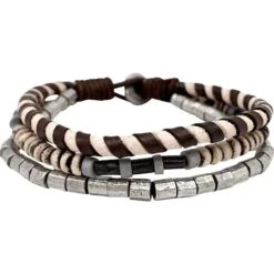 From Viking warriors to Norse maidens, there are many characters that look good wearing the Tri-Strand Beaded Viking Bracelet. Made from jute and leather cord, this handmade bracelet secures with a toggle on the end. It has three strands. One strand consists of brown and tan leather twisted around each other. Stone beads cover the second strand. The beads are different colors. They come in natural, grey, and black. The last strand has silver-colored metal beads. This bracelet fits a variety of Viking outfits or jewelry collections.