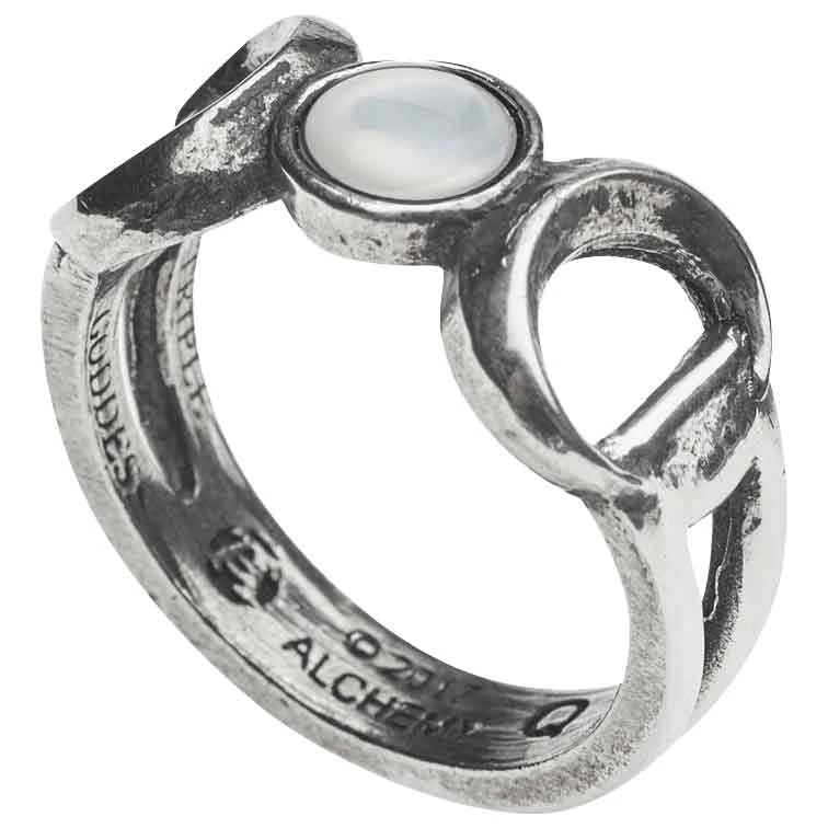 The pearlescent full moon flanked by crescent moons that are featured on the Triple Goddess Ring is the symbol of the Wicca Triple Goddess. The Triple Goddess is shown as a Maiden, a Mother, and a Crone, hence the triple moons. This delicate, split shank style ring is made in England from fine English pewter, possesses an antiqued finish, and is set with a mother of pearl cabochon full moon. The size of the ring is engraved on the inside of the band. This beautiful piece of Wiccan jewelry, with its conservative size and style, makes it the perfect accessory for any casual or formal attire. Combine it with our Triple Goddess Studs (AG-E401) and our Triple Goddess Choker (AG-P810) to complete your look! Know anybody who is interested in the Wiccan fashion? Give this pewter ring to them as a gift!